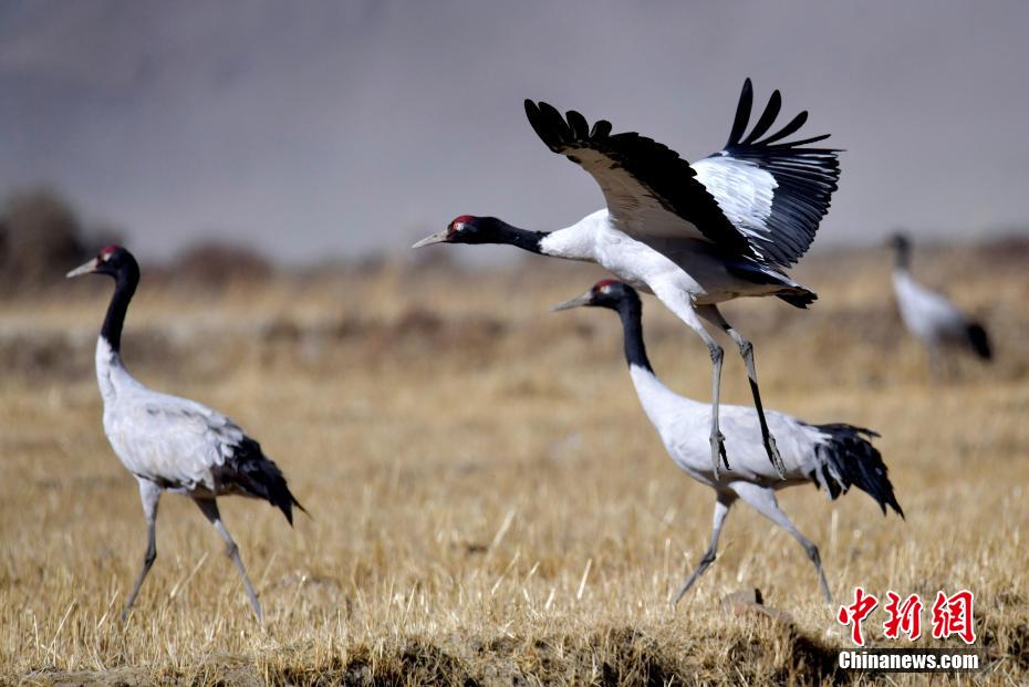 圖為(wei) 11月21日,西藏日喀則市桑珠孜區邊雄鄉(xiang) ,黑頸鶴在田間覓食、嬉戲。李林 攝