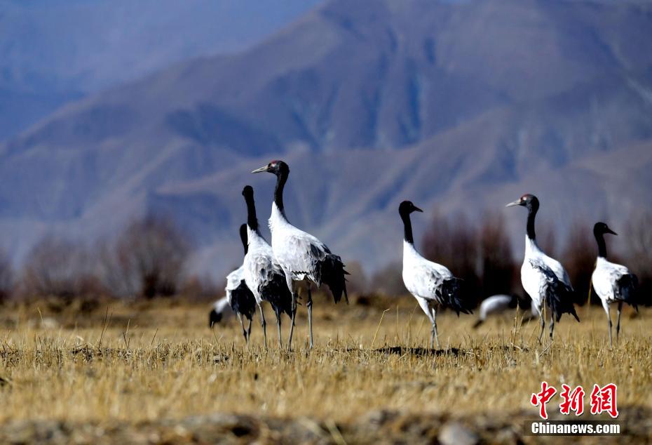 圖為(wei) 11月21日,西藏日喀則市桑珠孜區邊雄鄉(xiang) ,黑頸鶴在田間覓食。李林 攝