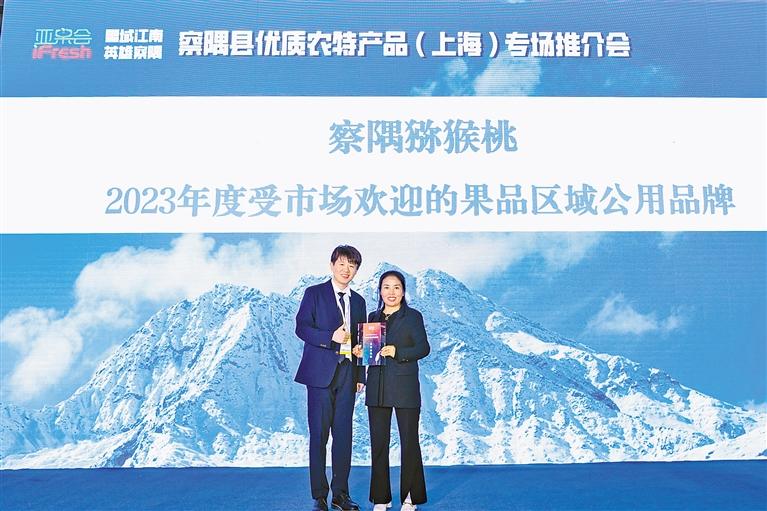 察隅獼猴桃獲得第十六屆iFresh亞(ya) 洲果蔬產(chan) 業(ye) 博覽會(hui) “2023年度受市場歡迎的果品區域公用品牌”的榮譽。 圖片由本報記者 謝筱純 王珊 攝
