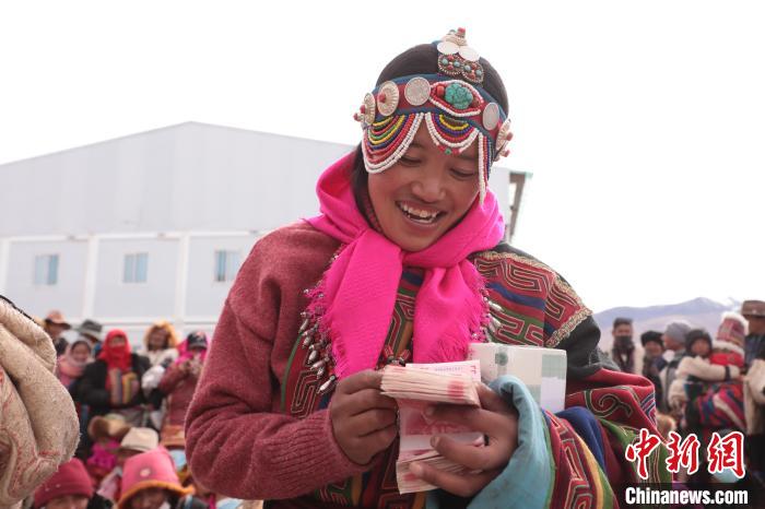 圖為(wei) 合作社社員領到現金分紅。索朗仁青 攝