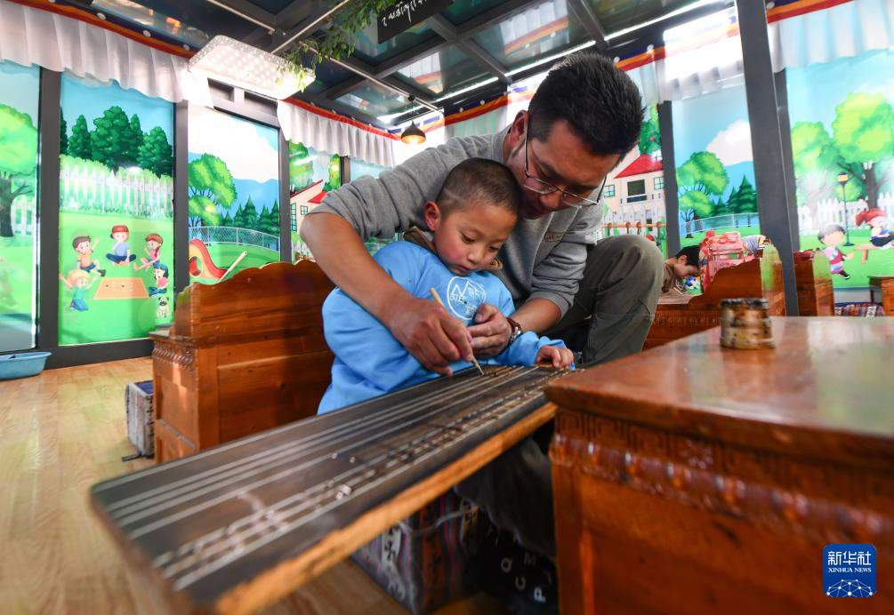 在拉薩的一家藏文書(shu) 法興(xing) 趣班裏,老師指導學生使用“牆星”練習(xi) 藏文書(shu) 法(12月2日攝)。新華社記者 春拉 攝