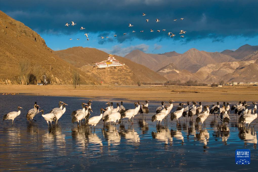 這是12月5日清晨在拉薩市林周縣虎頭山水庫拍攝的越冬黑頸鶴。新華社記者 薑帆 攝