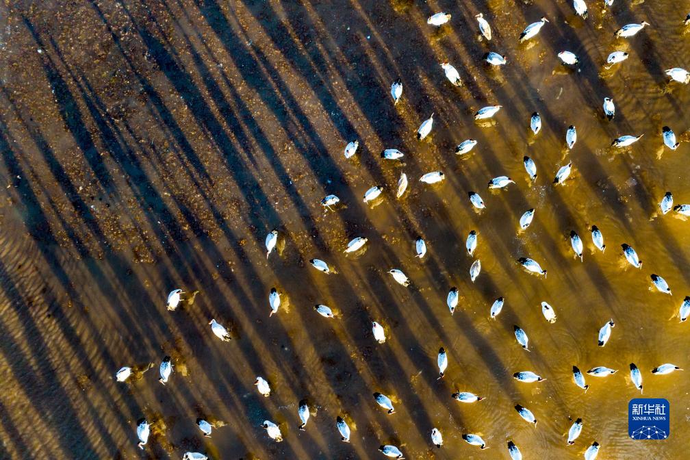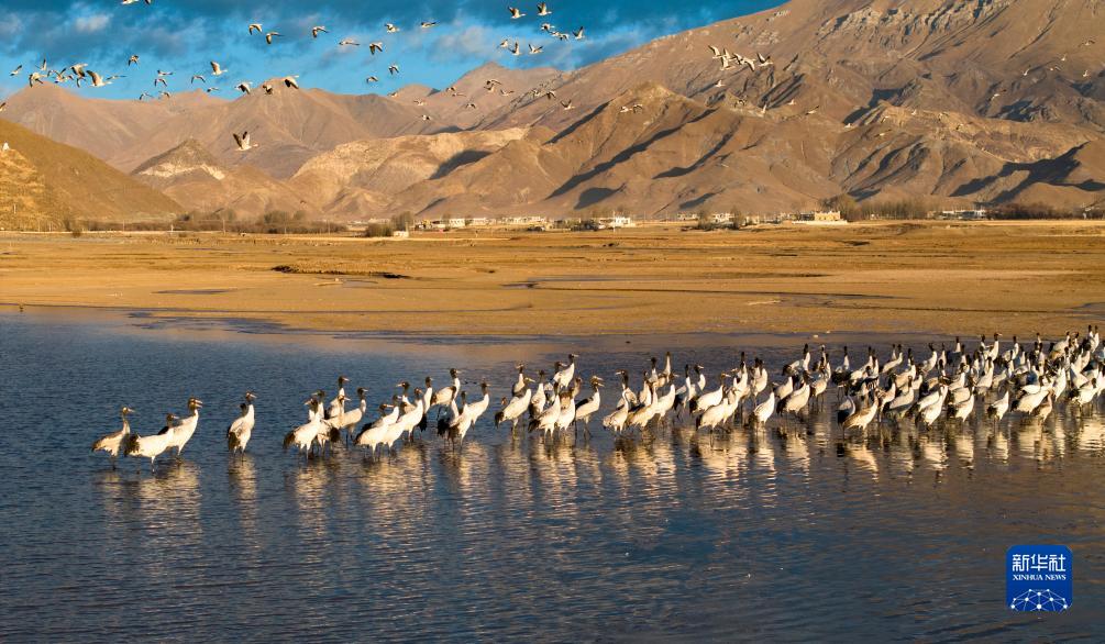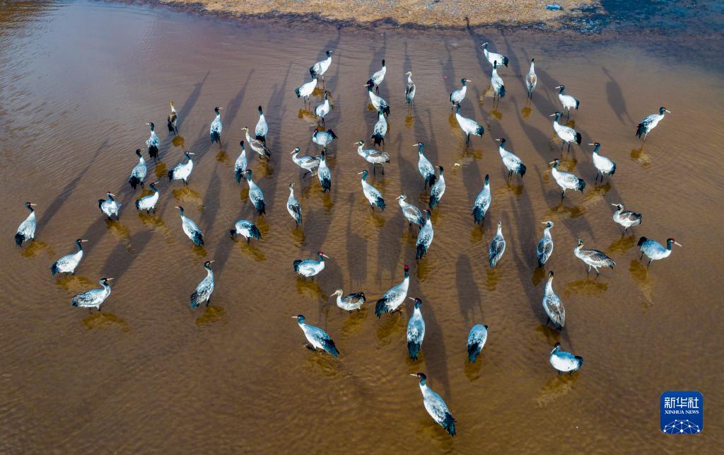 這是12月5日清晨在拉薩市林周縣虎頭山水庫拍攝的越冬黑頸鶴(無人機照片)。新華社記者 薑帆 攝