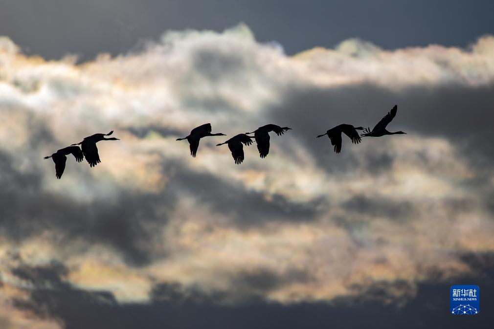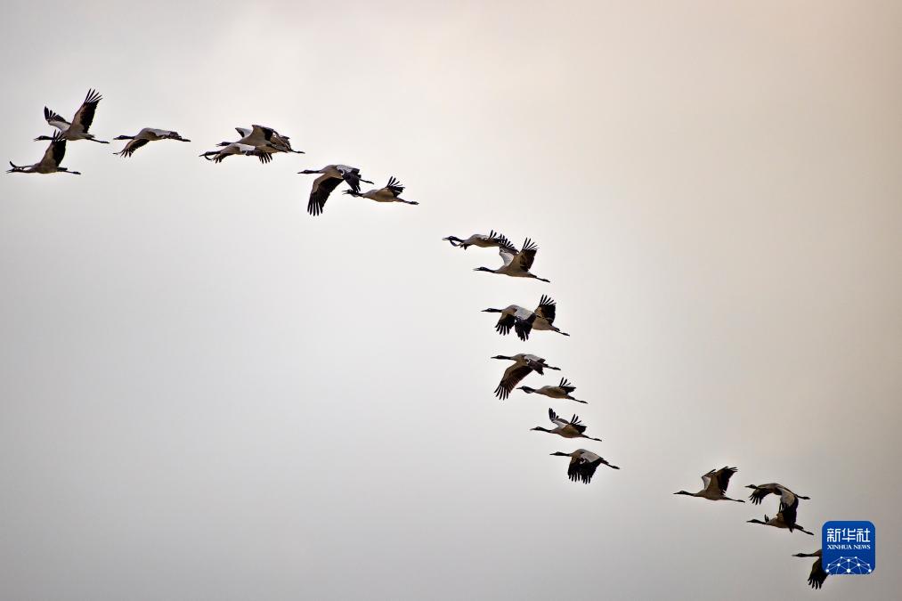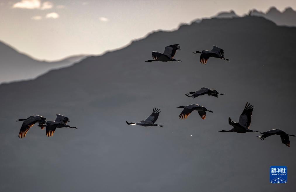 這是12月5日清晨在拉薩市林周縣虎頭山水庫拍攝的越冬黑頸鶴。新華社記者 曹檳 攝