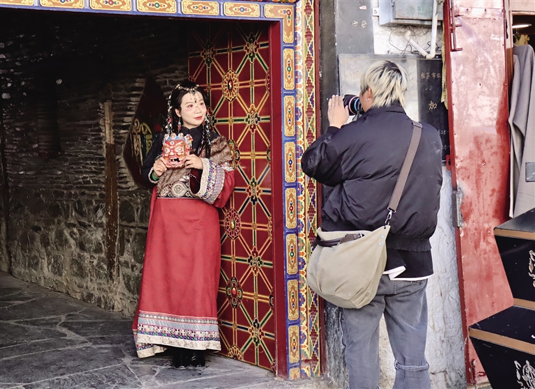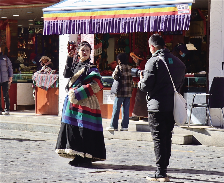 八廓街內(nei) 體(ti) 驗藏裝寫(xie) 真的遊客。記者 張琳 攝