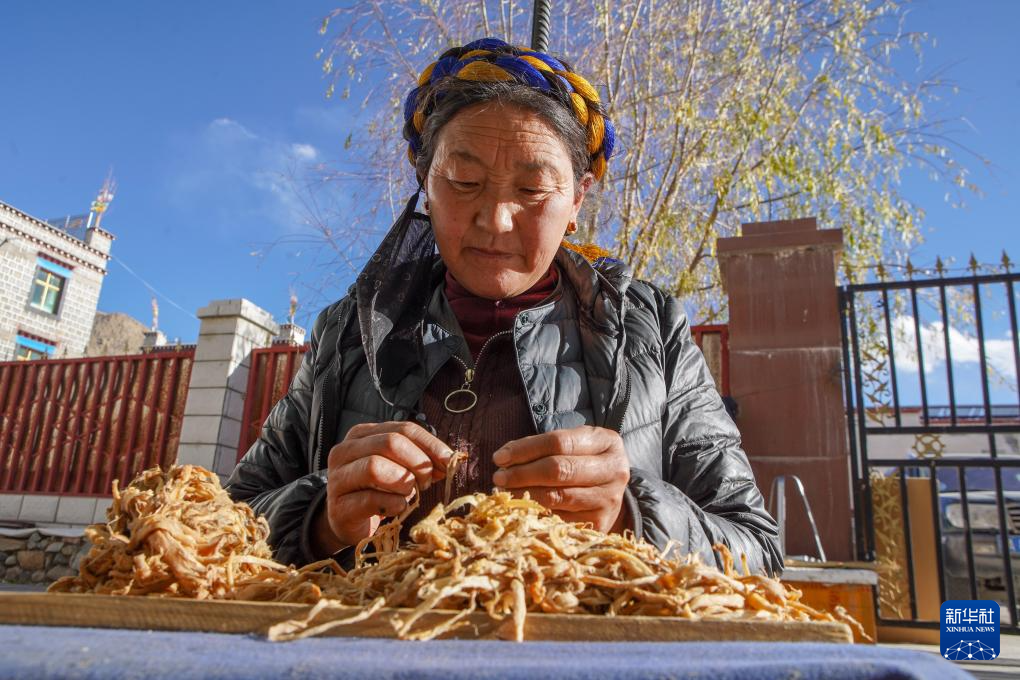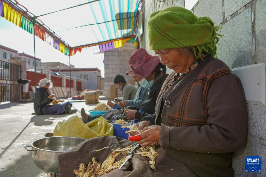 尼木縣塔榮鎮雪拉村村民在給狼毒草分絲(si) ,這是製作藏紙的步驟之一(12月5日攝)。新華社記者 關(guan) 明輝 攝