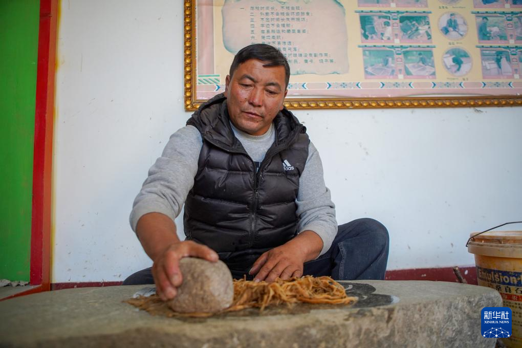 格桑旦增的弟弟普瓊用石頭捶打狼毒草,這是製作藏紙的步驟之一(12月5日攝)。新華社記者 關(guan) 明輝 攝