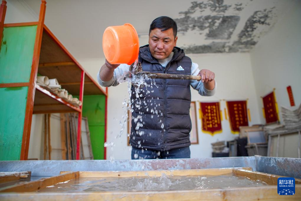 格桑旦增在檢查剛取出的藏紙的質量(12月5日攝)。新華社記者 邵澤東(dong) 攝