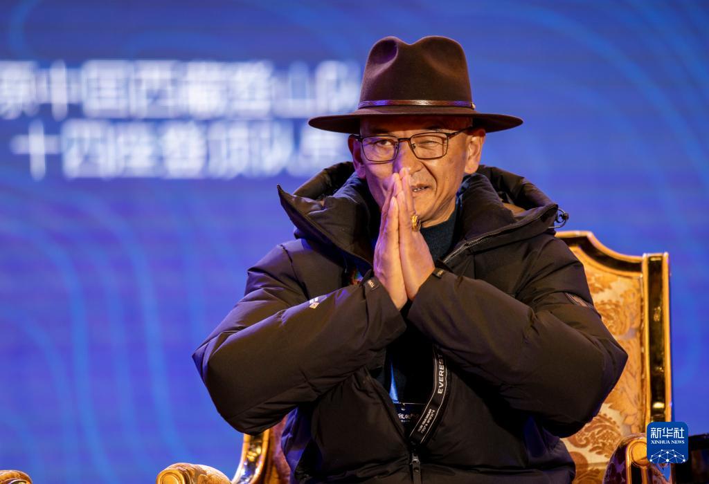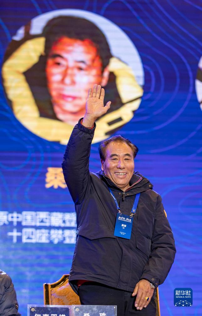 12月11日,原西藏登山隊登頂世界十四座海拔8000米以上高峰探險隊隊長桑珠在交流大會(hui) 上向觀眾(zhong) 致意。新華社記者 薑帆 攝