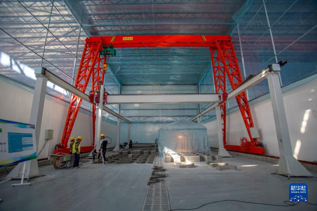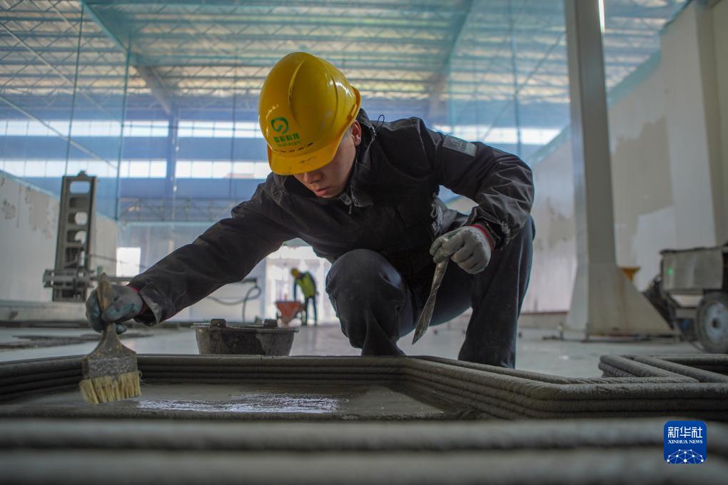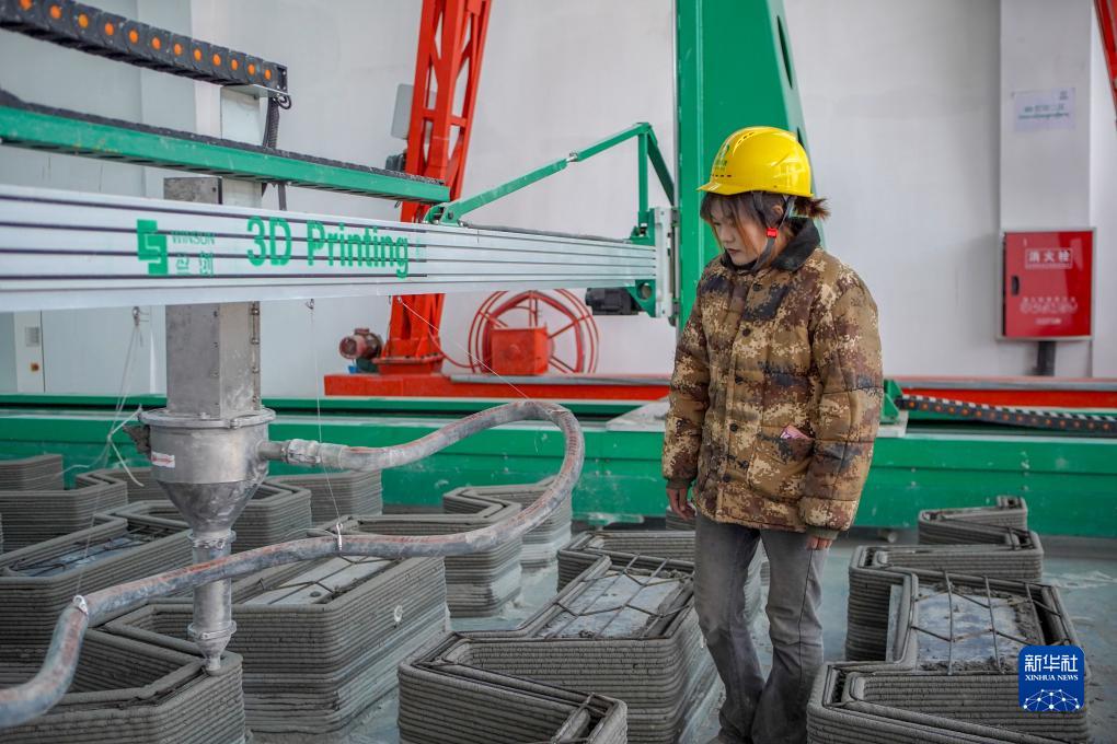 工人在一台3D打印建築機器旁工作(12月12日攝)。新華社記者 劉文博 攝