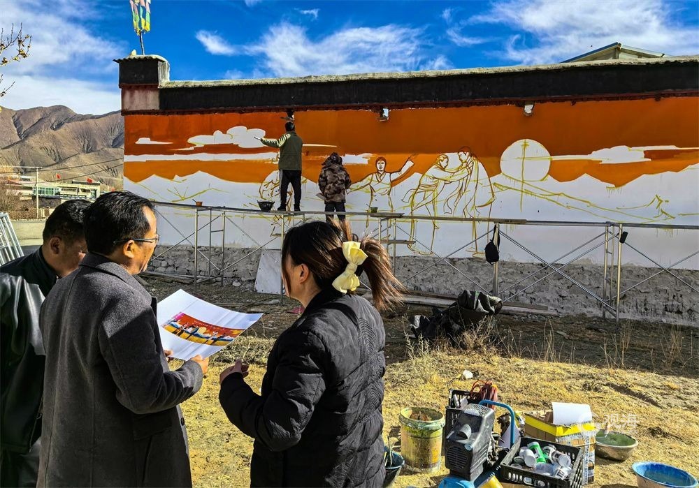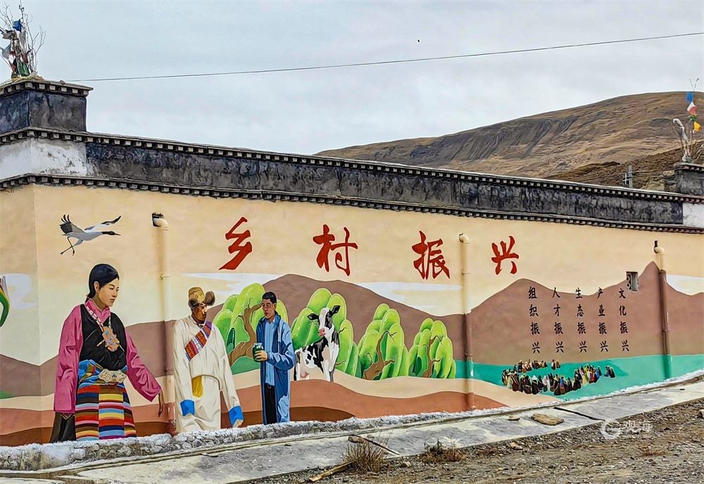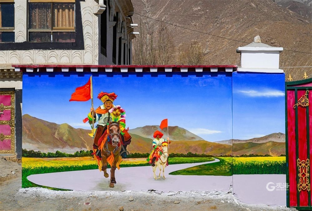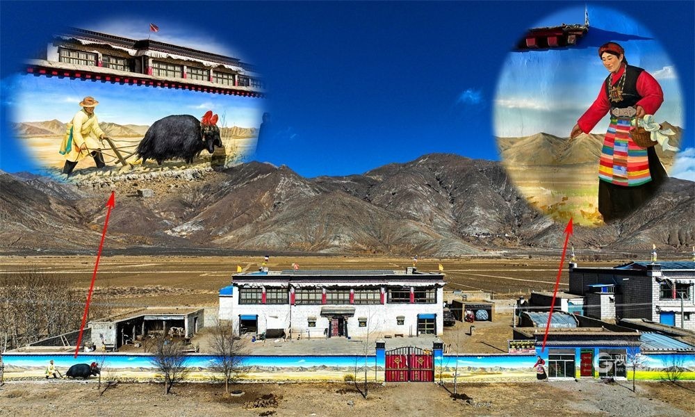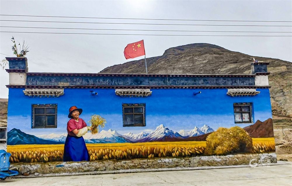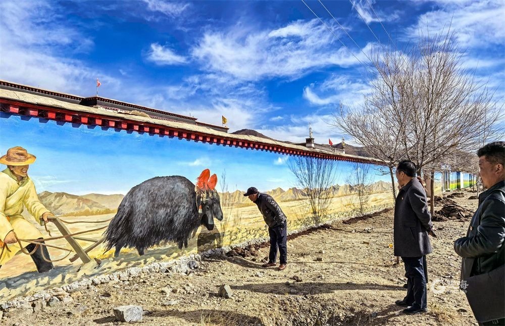廣袤的高原上,在連綿起伏的山巒之下,是藏族農(nong) 家趕著傳(chuan) 統的“二牛抬杠”耕耘的場景,旁邊的“阿佳”則撒下希望的青稞種子……這樣的場景當然不會(hui) 出現在現在這個(ge) 滴水成冰的季節,而是躍然於(yu) 藏家傳(chuan) 統村居的院牆之上。“我家這麵牆原來就是貼滿了牛糞,現在畫上了我們(men) 平時勞動的景象,感覺比之前更好看了。”桑珠孜區東(dong) 嘎鄉(xiang) 色定村的村民旦瓊說,此前的一年又一年,他都是把牛糞貼在牆上,固然有傳(chuan) 統的高原美感,但是與(yu) 現在院牆上畫的鄉(xiang) 村振興(xing) 的場景相比,還是現在的感覺更不錯。