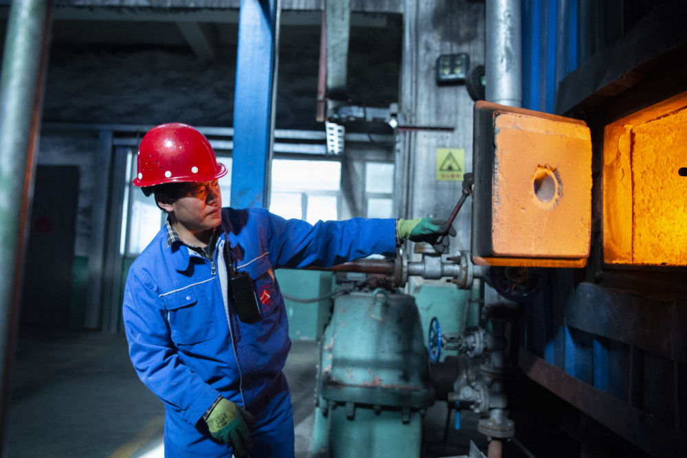 12月15日,熱源廠工人紮巴在查看鍋爐燃燒情況。新華社發(旦增努布攝)