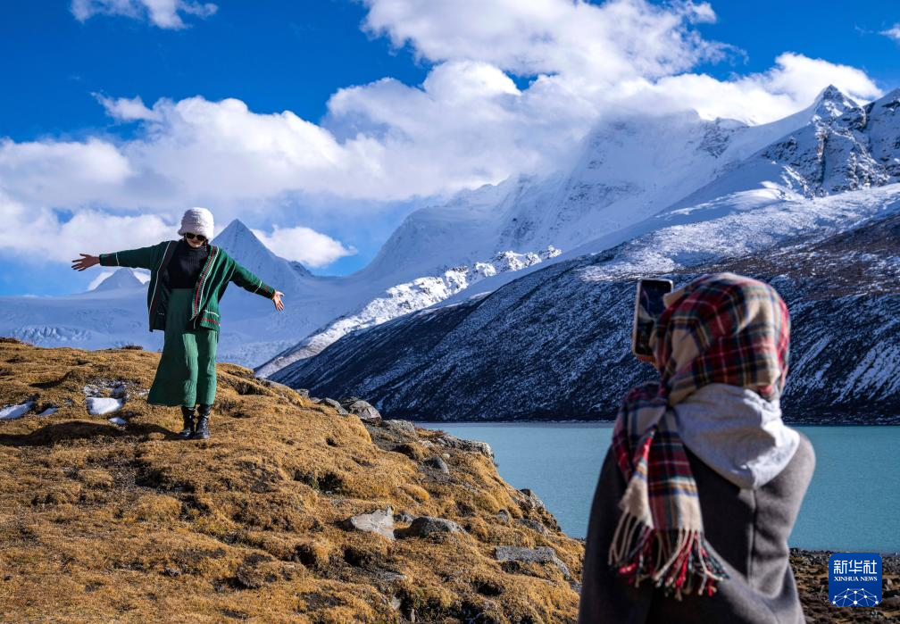 遊客在那曲市比如縣羊秀鄉(xiang) 薩普雪山腳下拍照留念(10月28日攝)。新華社記者 孫非 攝