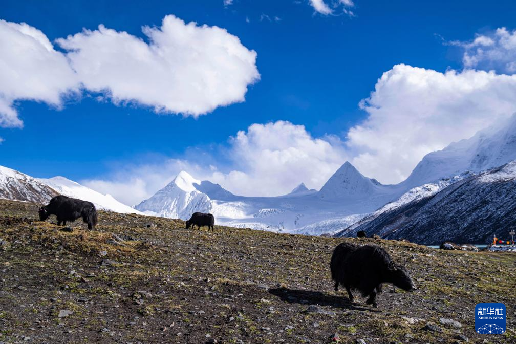 犛牛在那曲市比如縣羊秀鄉(xiang) 薩普雪山腳下的草場上吃草(10月28日攝)。新華社記者 孫非 攝