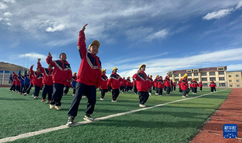 10月13日,在西藏那曲市班戈縣中石化小學,學生在操場上跳“班戈諧欽”課間操。新華社發(孔琳琳 攝)