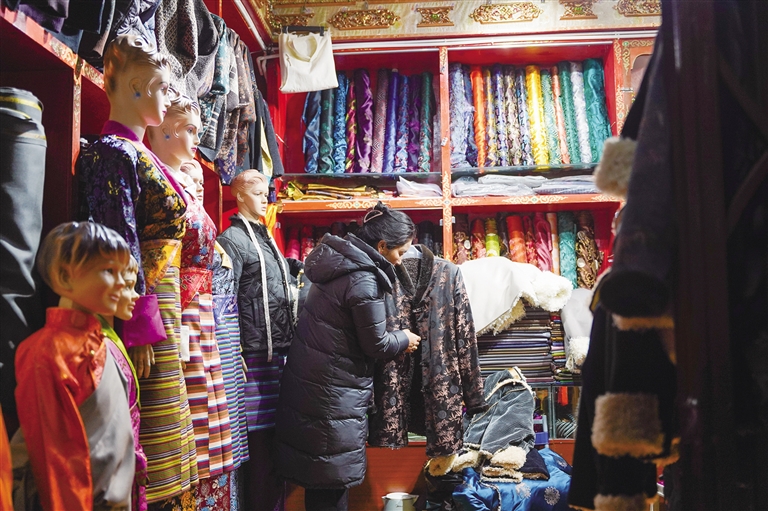 年輕一代熱愛傳(chuan) 統,也擁抱時尚,渴望盡情扮靚生活,為(wei) 傳(chuan) 統文化注入新的時代活力。“我這次專(zhuan) 門買(mai) 了一件拉薩傳(chuan) 統藏裝和一件‘泡泡袖’藏裝,打算在單位年會(hui) 時穿,給大家看看西藏傳(chuan) 統服飾,也向大家展示藏裝時尚的一麵。”次仁卓瑪說。