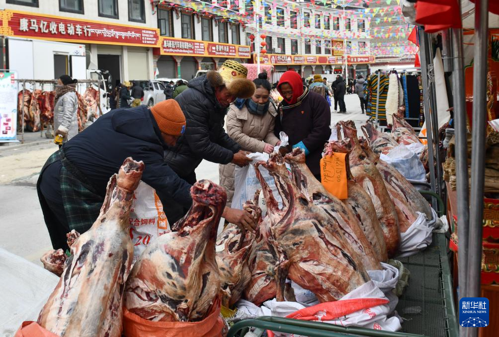 12月13日,在西藏日喀則市康馬縣冬季物資文化交流會(hui) 上,當地群眾(zhong) 在購買(mai) 羊肉。新華社記者格桑朗傑 攝