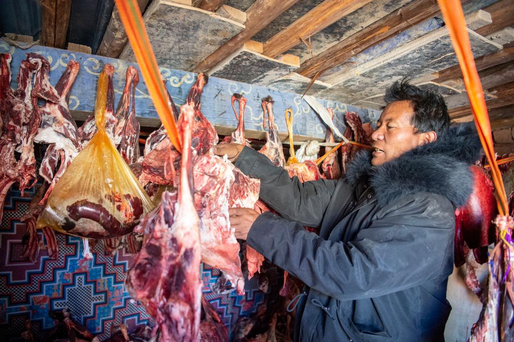 12月18日,嘎瑪熱傑在家中倉(cang) 庫裏檢查過冬肉食。新華社記者劉文博 攝
