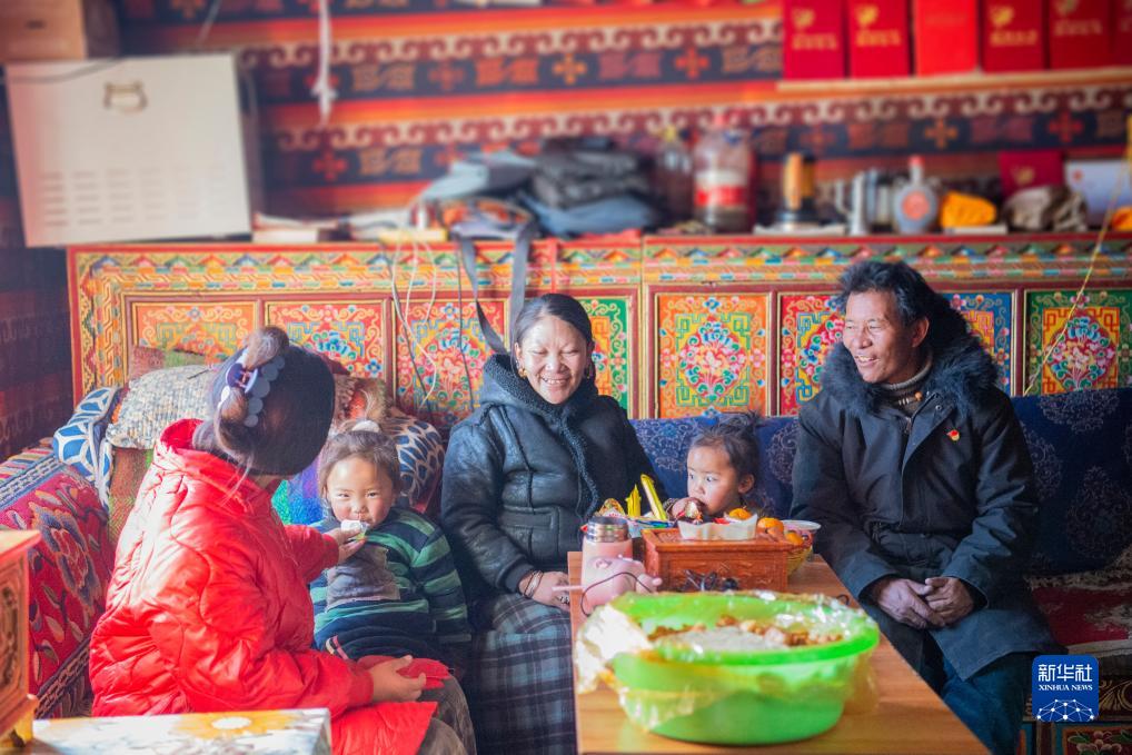 尼瑪縣尼瑪鎮魯根村村民嘎瑪熱傑一家(12月18日攝)。新華社發(旦增努布攝)