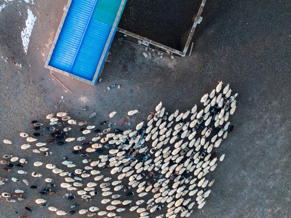 丹增家的羊正進入新羊圈(12月18日攝,無人機照片)。新華社記者薑帆 攝