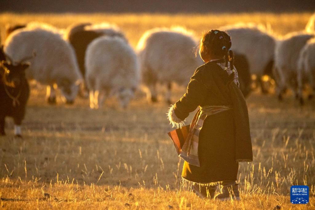 太陽落山,丹增的妹妹、4歲的拉姆卓瑪奔向牧歸的羊群(12月18日攝)。新華社記者 薑帆 攝