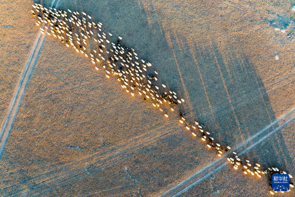 太陽落山,丹增家的羊從(cong) 草場趕回棚圈(無人機照片,12月18日攝)。新華社發(旦增努布攝)