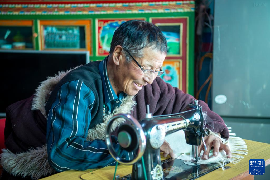 12月20日,古曲紮巴在家中免費幫村民縫製衣物。新華社發(旦增努布 攝)