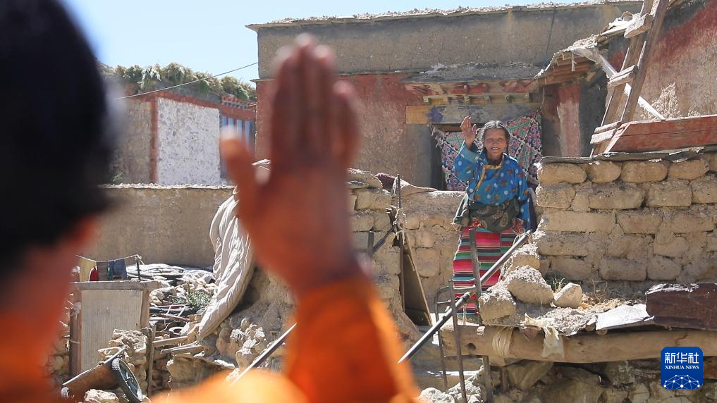 古曲紮巴為(wei) 孤寡老人央珍(右)送去牛糞燃料後向她道別(2019年9月20日攝)。新華社發