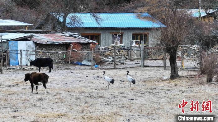 圖為(wei) 西藏林芝市工布江達縣錯高村裏的黑頸鶴。紮頓 攝