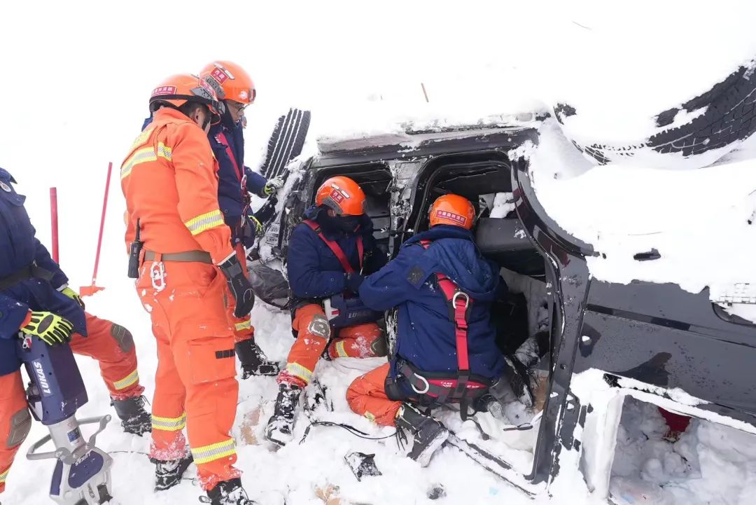 65名隊員到達現場時,天已經黑透,周圍大風呼嘯,數輛受災車輛被直接埋壓在雪下,救援難度很大,很多隊員都心裏直打顫。