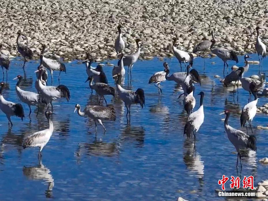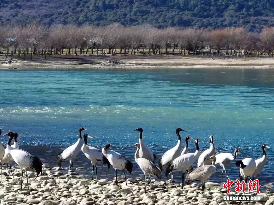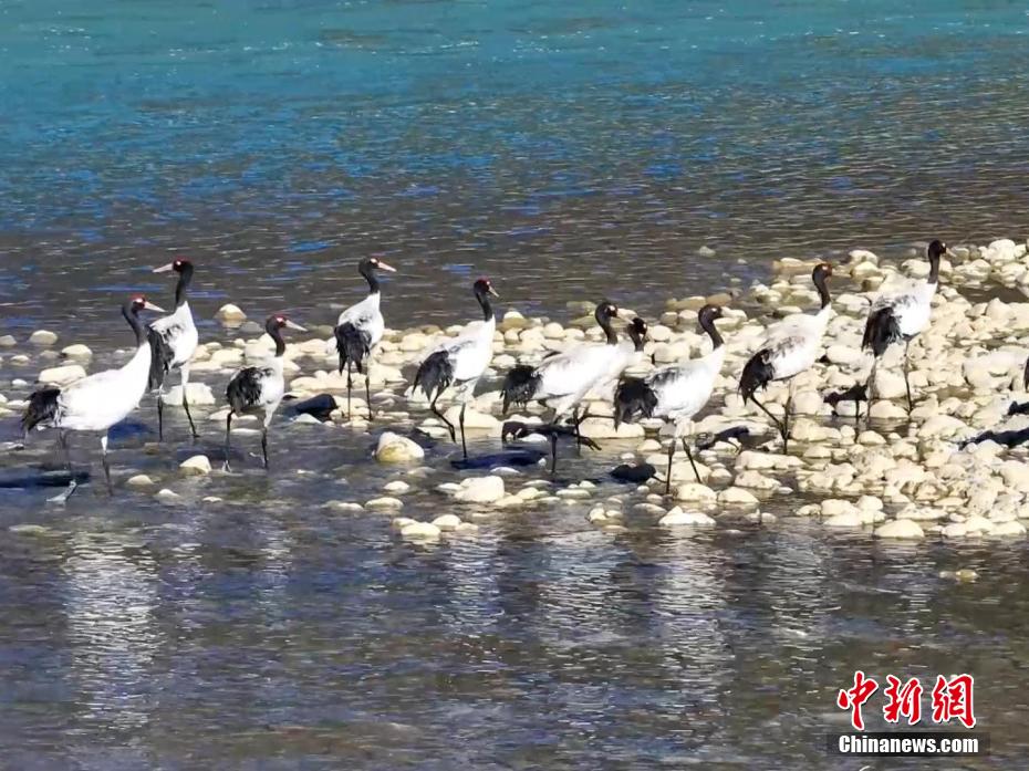 圖為(wei) 黑頸鶴在雅魯藏布江畔覓食、嬉戲。德吉 攝