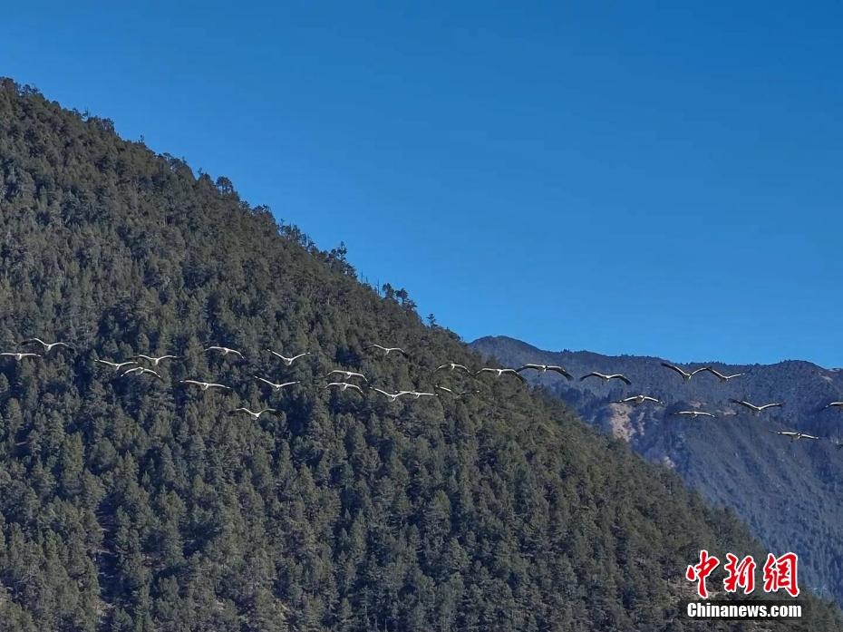 圖為(wei) 黑頸鶴在雅魯藏布江上空飛舞。袁相普 攝