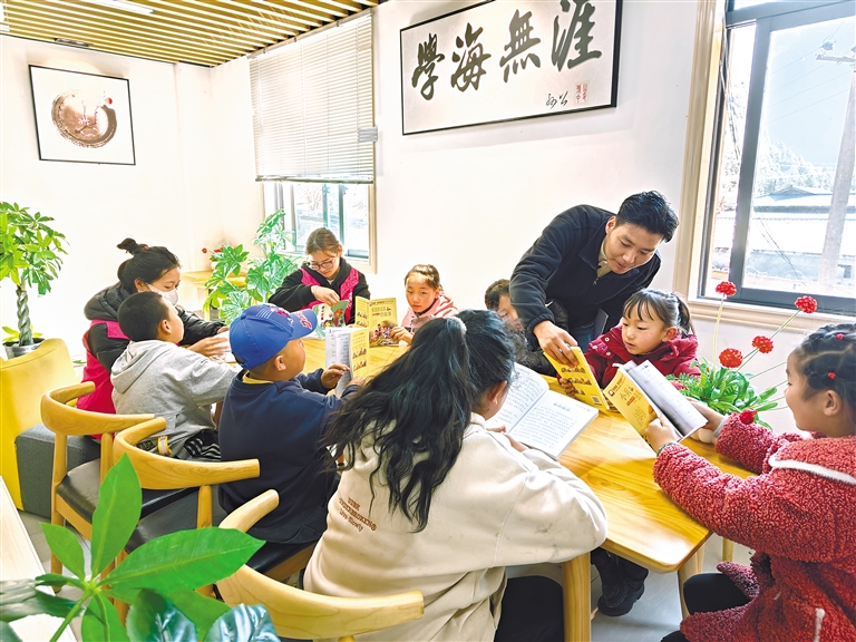 新時代文明實踐誌願服務隊成員在紮拉村農(nong) 家書(shu) 屋輔導孩子閱讀書(shu) 籍。謝筱純 王珊 攝