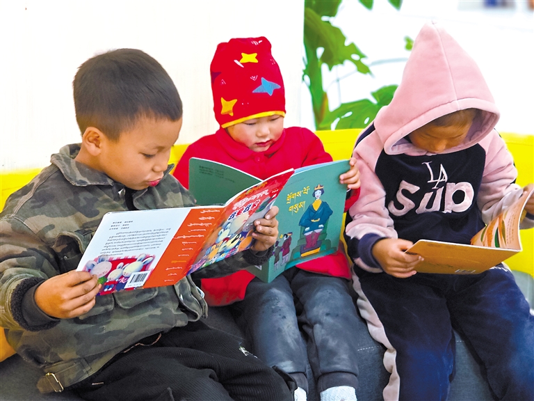 紮拉村的孩子在新時代文明實踐誌願服務隊成員的輔導下閱讀藏文繪本。謝筱純 王珊 攝