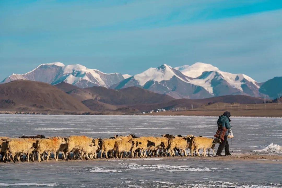 它是世界上海拔最高的村落之一,當地村民都以放牧為(wei) 生。寒冬來臨(lin) ,岸上的牧場草料已經不夠羊群過冬,推瓦村的村民們(men) 把羊群集結在一起,在冰湖上撒牛糞爐灰,畫出一道冰麵上的“羊腸小道”把羊群趕上普姆雍錯湖心島上吃草過冬,雖然隻有幾公裏的距離,但這個(ge) 傳(chuan) 承千年的畫麵卻給人以史詩般的震撼與(yu) 感動。