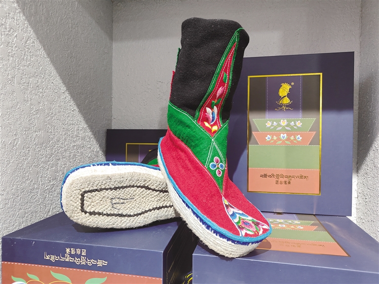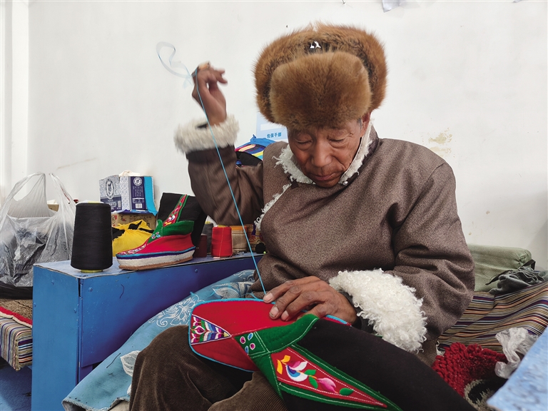 “藏靴樣式精美、花色靚麗(li) ,因材質和花色的不同分為(wei) ‘郭紮’‘郭朵’‘鬆巴’三種。‘郭紮’是節慶時穿,‘郭朵’‘鬆巴’可以日常穿,製作一雙藏靴需要一周左右的時間。這些藏靴不分左右,磨損後可以互換,還可以防潮防寒。”正在縫製藏靴的索朗頓珠雙手稍顯粗糲卻不失靈巧,他邊飛針走線,邊給記者介紹著手中的藏靴。厚而輕的鞋底、柔軟的靴麵,五顏六色的絲(si) 線繡出栩栩如生的多瓣蓮花,加上氆氌製成的鞋麵,一雙極具民族特色的藏靴展現在眼前。