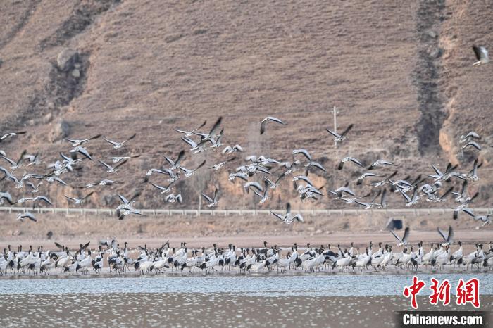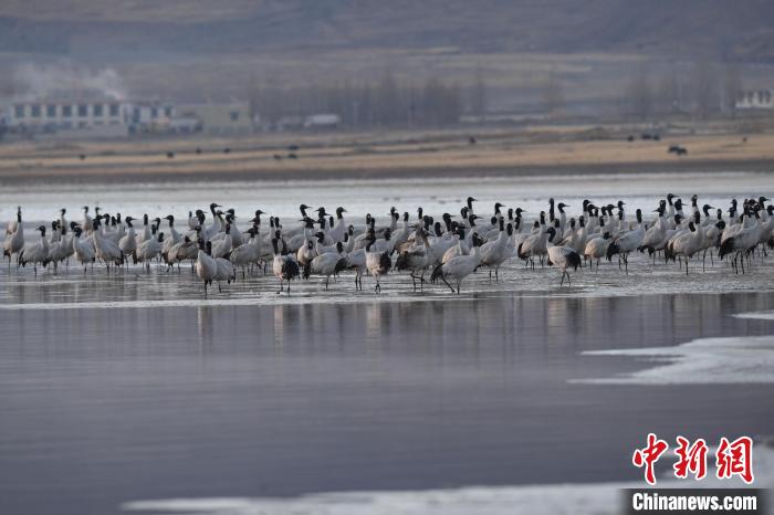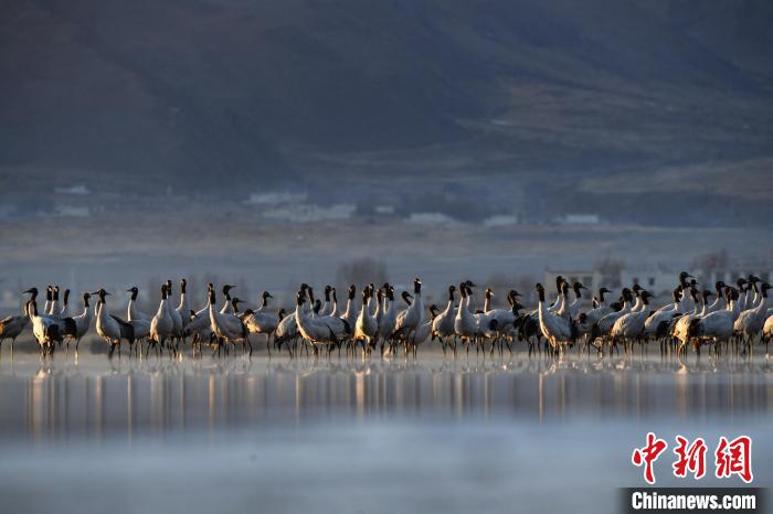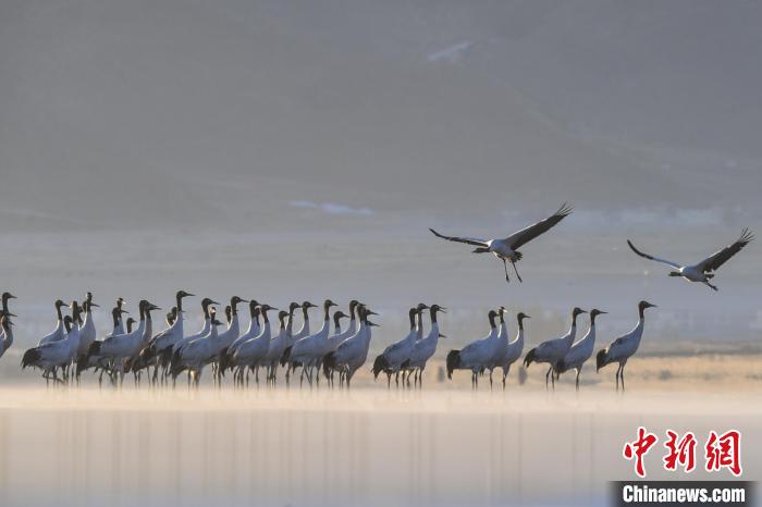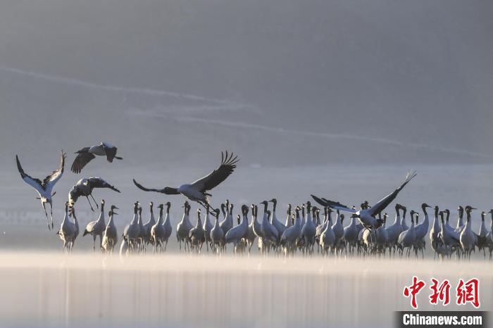 圖為(wei) 拉薩市林周縣虎頭山水庫越冬的黑頸鶴。貢嘎來鬆 攝