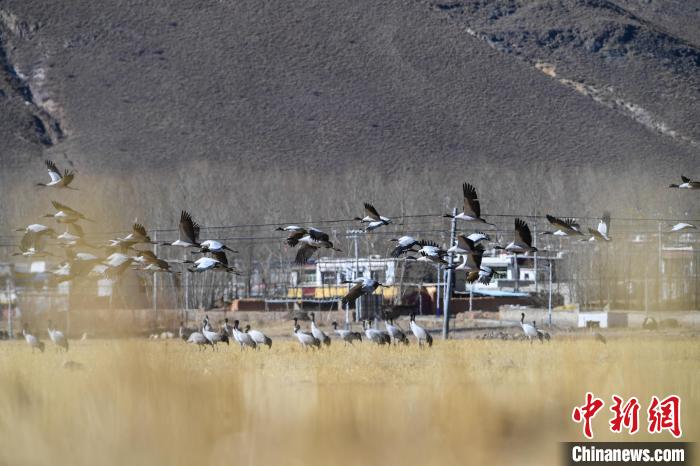 圖為(wei) 拉薩市林周縣田間飛翔的黑頸鶴。貢嘎來鬆 攝