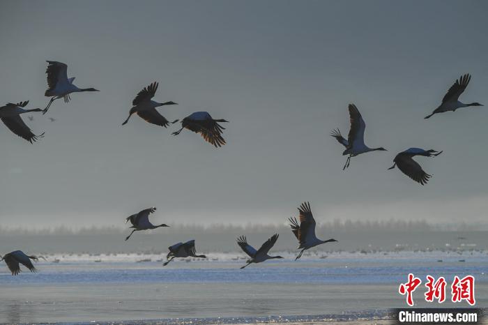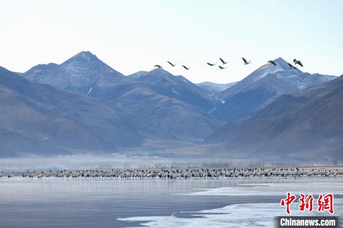 12月28日晨,西藏拉薩林周縣黑頸鶴保護區內(nei) ,黑頸鶴覓食、嬉戲。拉薩北部的林周縣平均海拔約4200米,是黑頸鶴的主要越冬地之一。目前,到林周縣越冬的黑頸鶴已達2000隻左右。近年來,西藏不斷加大黑頸鶴生存環境保護力度。據2022年冬季越冬黑頸鶴種群數量調查顯示,在西藏越冬的黑頸鶴種群數量達11175隻,種群數量持續增長,並在西藏全區均有分布。據悉,黑頸鶴是全球15種鶴類中,唯一一種在高原地區繁殖和越冬的鶴類,也是分布在中國的9種鶴類中,唯一的中國特有鶴類,屬國家一級保護野生動物。作為(wei) 青藏高原濕地的“風向標”,黑頸鶴在生物多樣性保護工作中具有非常重要的地位。