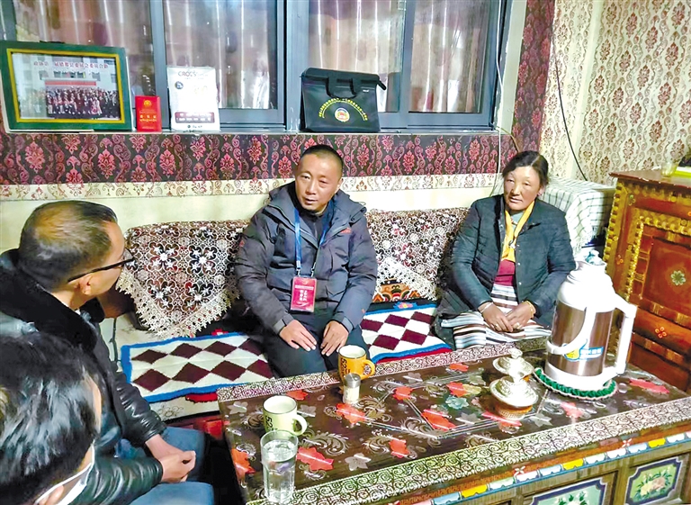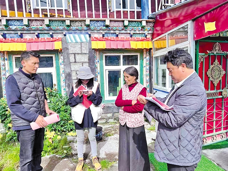 2023年9月26日,自治區人大代表歐珠(左一)在林芝市波密縣紮木鎮巴瓊村開展防止返貧監測工作。