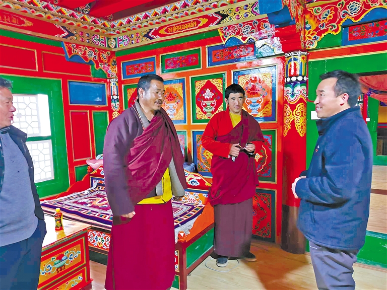 2023年11月17日,自治區人大代表段世昌(右)在昌都市江達縣汪布頂鄉(xiang) 根沙寺了解寺廟“三個(ge) 意識”宣傳(chuan) 教育開展情況。