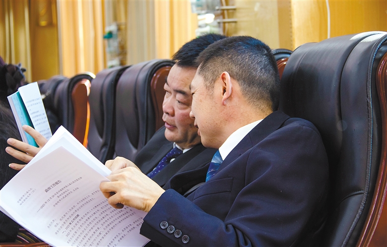 圖為(wei) 參會(hui) 前,市政協委員們(men) 在閱讀會(hui) 議材料。