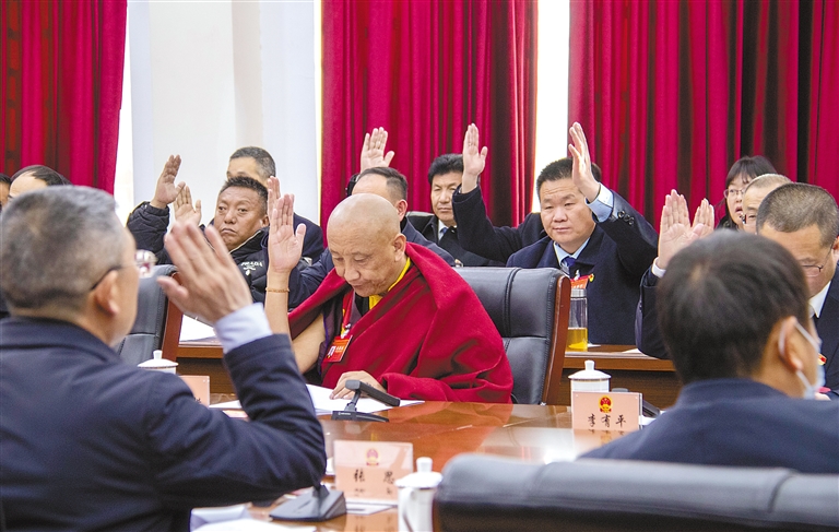 圖為(wei) 日喀則市第二屆人民代表大會(hui) 第四次會(hui) 議主席團第一次會(hui) 議主席團成員舉(ju) 手表決(jue) 。