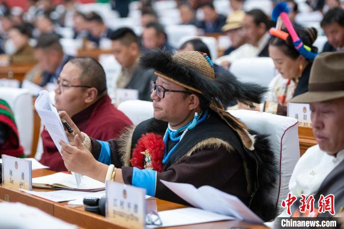 圖為(wei) 西藏政協委員身著民族服飾參加開幕會(hui) 。貢嘎來鬆 攝