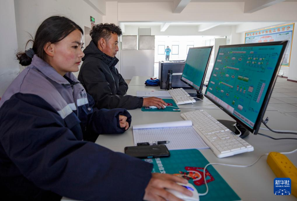 供暖工程的運維管理方申紮淨地市政管理有限公司經理楊參奎(後)和同事在管理係統上監控供暖係統運行(1月6日攝)。新華社記者 薑帆 攝