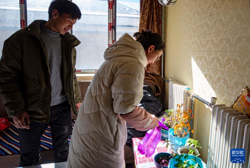 距離太陽能集熱場約3公裏外的縣職工周轉房小區是供暖工程的最遠端,年輕夫妻曲珠(左)和央次仁在家中侍弄花草(1月6日攝)。新華社記者 薑帆 攝