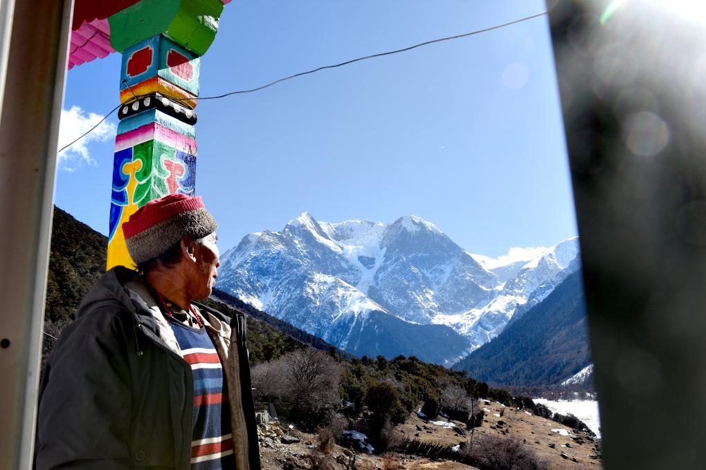 達瓦江村在自己的民宿二樓眺望梅裏雪山群峰(1月5日攝)。新華社記者劉文博 攝