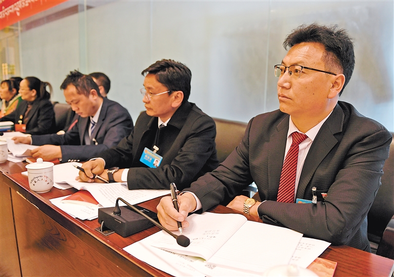 委員們(men) 認真聆聽政協常委會(hui) 工作報告。記者 洛桑 攝