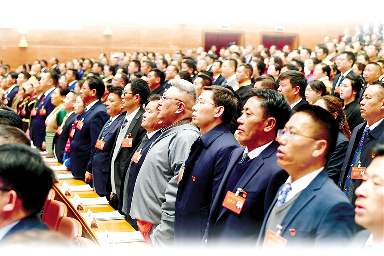 圖為(wei) 西藏自治區人大代表們(men) 齊唱國歌。 記者 潘多 攝