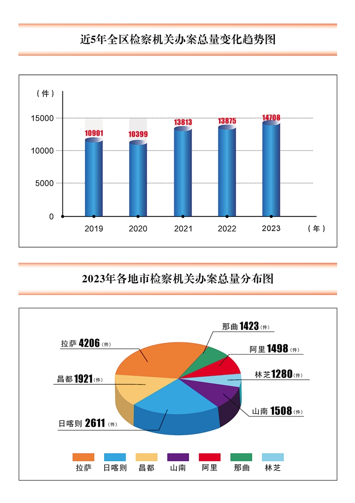 “2023年,全區檢察機關(guan) 在自治區黨(dang) 委和最高檢正確領導下,以習(xi) 近平新時代中國特色社會(hui) 主義(yi) 思想為(wei) 指導,深入貫徹習(xi) 近平法治思想、習(xi) 近平總書(shu) 記關(guan) 於(yu) 西藏工作的重要指示和新時代黨(dang) 的治藏方略,全麵貫徹黨(dang) 的二十大精神、自治區第十次黨(dang) 代會(hui) 和十屆區黨(dang) 委曆次全會(hui) 精神、全國檢察長會(hui) 議精神,認真落實自治區十二屆人大一次會(hui) 議決(jue) 議,自覺把檢察工作放到黨(dang) 的治藏穩藏興(xing) 藏大局中謀劃推進,聚焦‘四件大事’聚力‘四個(ge) 創建’,忠誠依法能動高質效履職取得新成效。全年辦理各類法律監督案件14708件,同比增長6%。依法主動辦案8030件,占54.6%,主動辦案量首次超過被動受理案件量。‘四大檢察’結構持續優(you) 化為(wei) 56∶18∶7∶19,業(ye) 務質效穩步提升。”1月8日下午,西藏自治區人民檢察院檢察長夏克勤在西藏自治區第十二屆人民代表大會(hui) 第二次會(hui) 議上作工作報告。報告全麵反映了西藏檢察機關(guan) 一年來始終牢記“國之大者”,以實現“努力讓人民群眾(zhong) 在每一個(ge) 司法案件中感受到公平正義(yi) ”為(wei) 目標,深入踐行“高質效辦好每一個(ge) 案件”,充分發揮檢察職能作用,在為(wei) 大局服務、為(wei) 人民司法、為(wei) 法治擔當中所做的主要工作,同時描繪了2024年的西藏檢察工作藍圖。